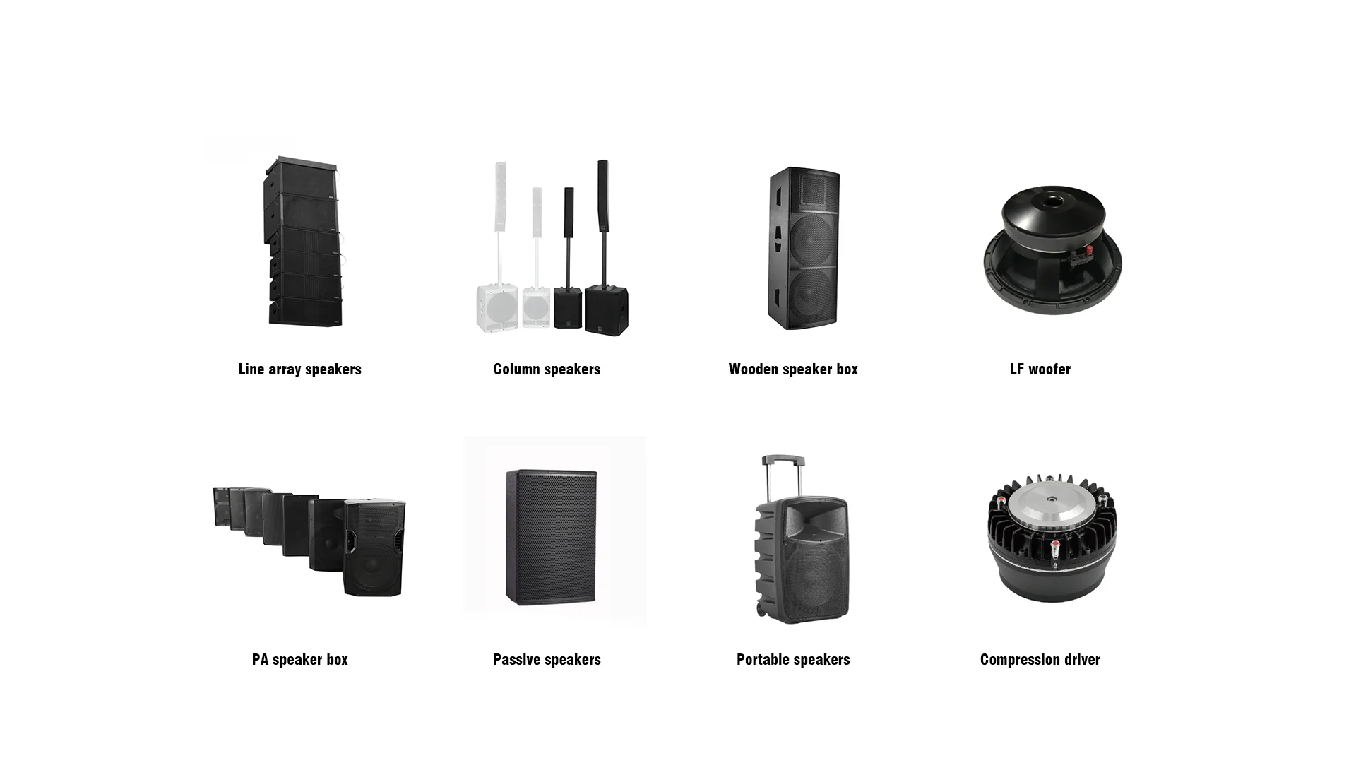 Main categories: PA Speaker, Woofer, Line Array, Column Speaker, Tweeter